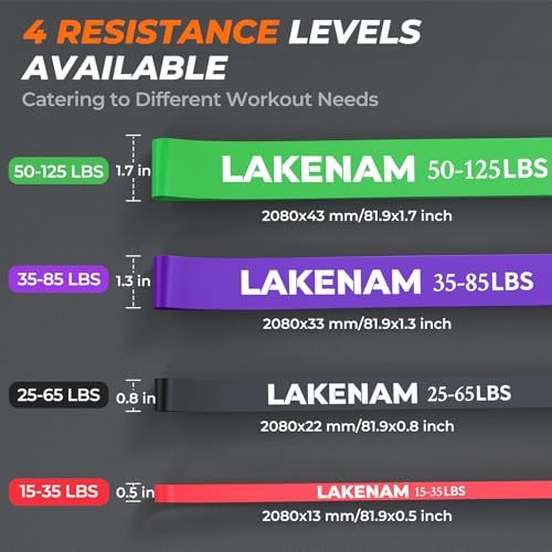 [MULTIPLE RESISTANCE LEVELS]: 4 different colored bands, each clearly marked with weight specifications for different tensile strengths: Red 15-35 lbs, Black 25-65 lbs, Purple 35-85 lbs, Green 50-125 lbs. Use one band or combine multiple bands for different tensile strengths.