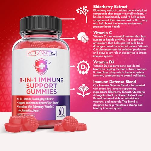 Atlantis Nutrition 8-in-1 Immune Support Gummies with Elderberry | Immune Supplement with Elderberry, Quercetin, Zinc, Vitamin C – Immunity Boosters for Adults & Kids – Delicious Flavor – 60 Count